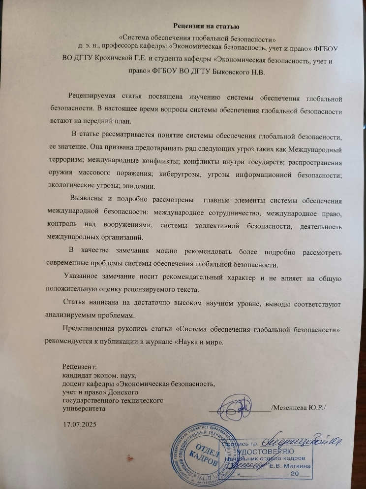 Представленная рукопись статьи «Система обеспечения глобальной безопасности» рекомендуется к публикации в журнале «Наука и мир».