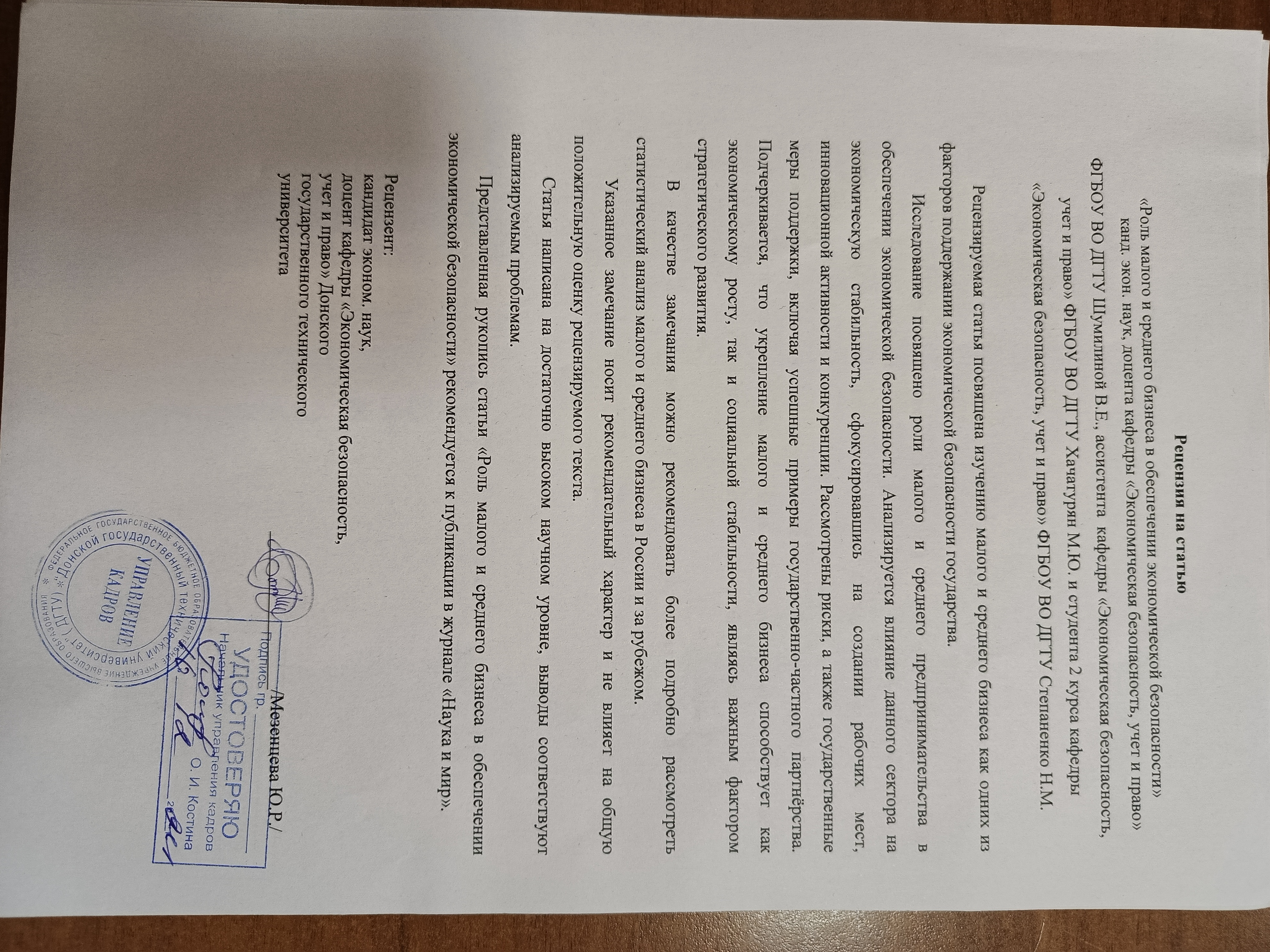 Представленная рукопись статьи «Роль малого и среднего бизнеса в обеспечении экономической безопасности» рекомендуется к публикации в журнале «Наука и мир».