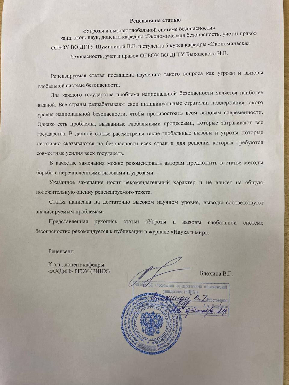Представленная рукопись статьи «Угрозы и вызовы глобальной системе безопасности» рекомендуется к публикации в журнале «Наука и мир».