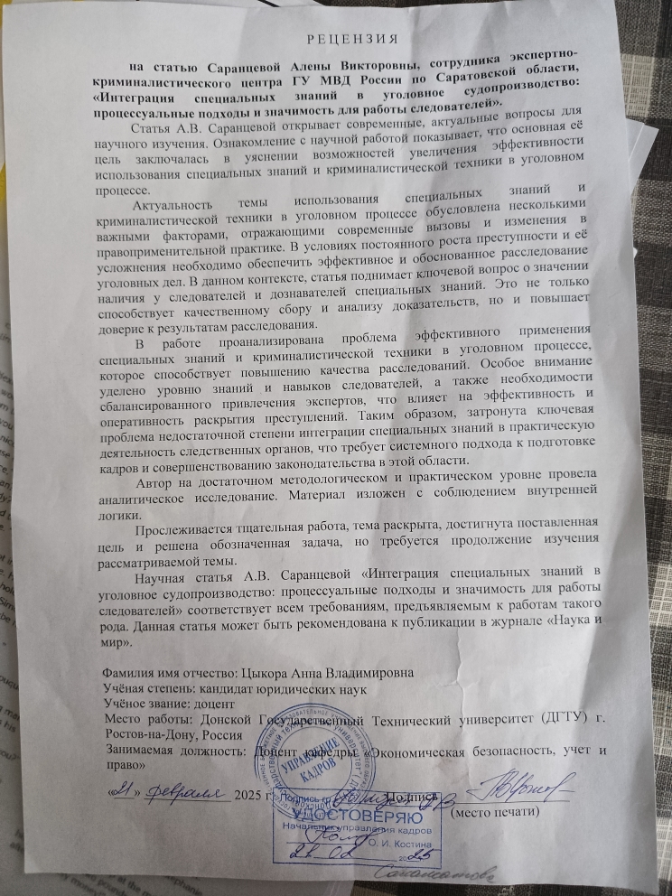на статью Саранцевой Алены Викторовны, сотрудника экспертно-криминалистического центра ГУ МВД России по Саратовской области, «Интеграция специальных знаний в уголовное судопроизводство: процессуальные подходы и значимость для работы следователей».