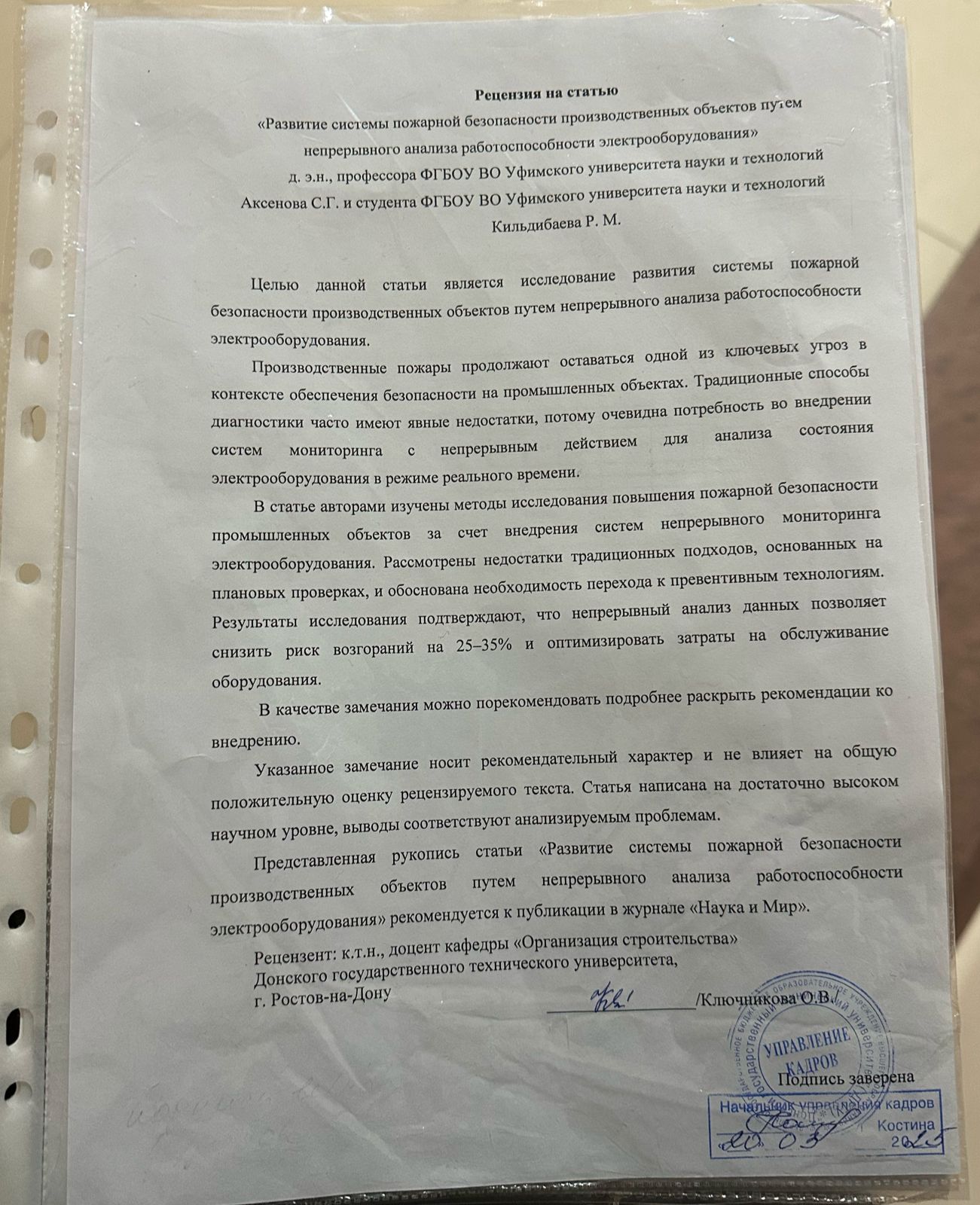 Представленная рукопись статьи «Развитие системы пожарной безопасности производственных объектов путем непрерывного анализа работоспособности электрооборудования» рекомендуется к публикации в журнале «Наука и Мир».