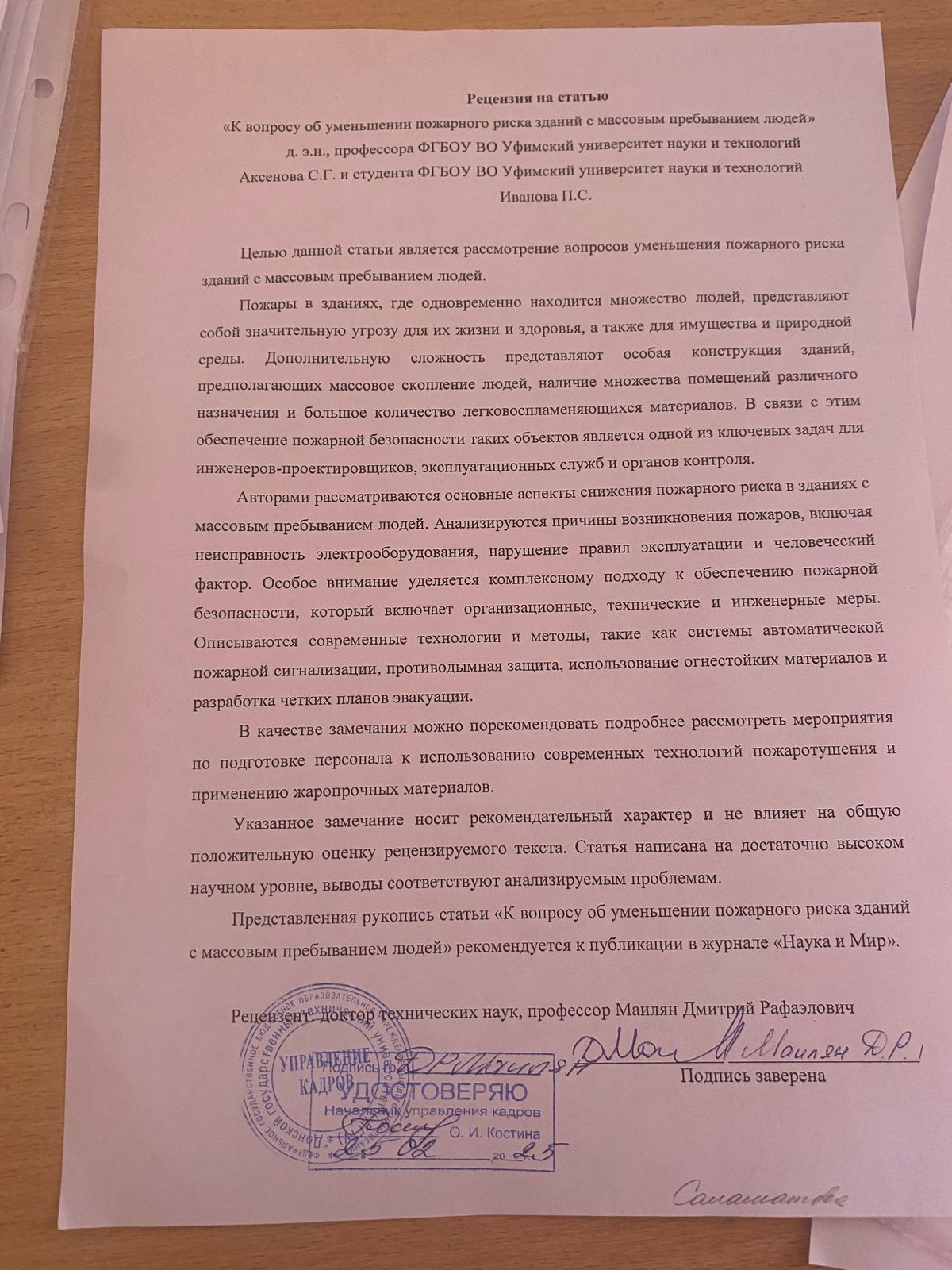Представленная рукопись статьи «К вопросу об уменьшении пожарного риска зданий с массовым пребыванием людей» рекомендуется к публикации в журнале «Наука и Мир».