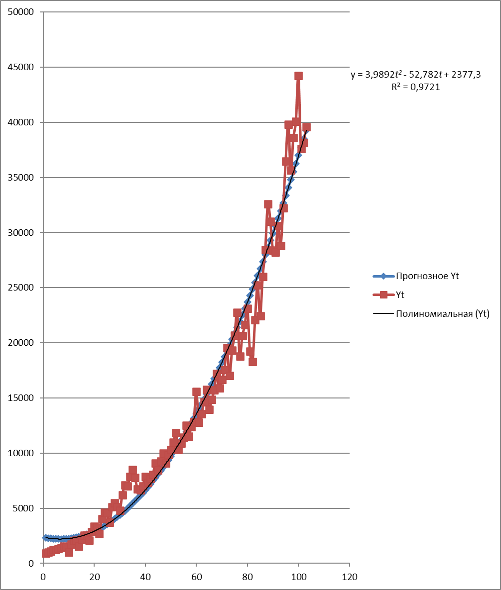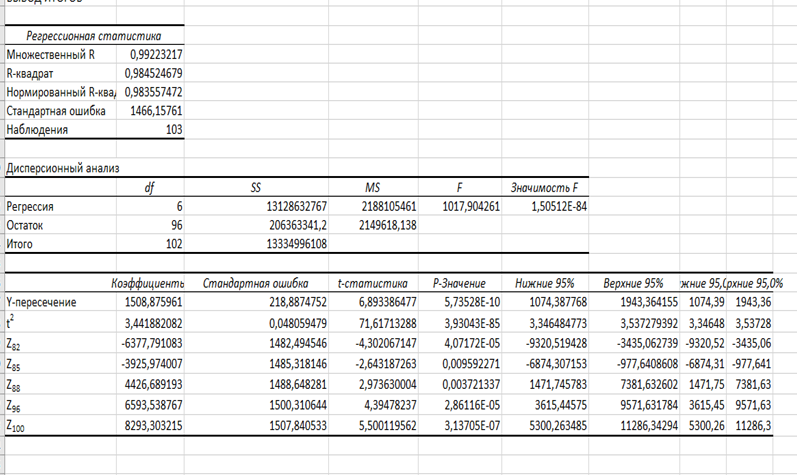 После построения первоначального тренда был проведён анализ остатков. По структуре данных видно, что наибольшие отклонения Yt от полиномиального тренда имеются при значениях t=82, 85, 88, 96, 100. После многочисленных попыток улучшения модели тренда с использованием фиктивных переменных получим окончательное уравнение полиномиального тренда с фиктивными переменными Z82, Z85, Z88, Z96, Z100, принимающими значение 1 для указанного периода t и 0 – для остальных: