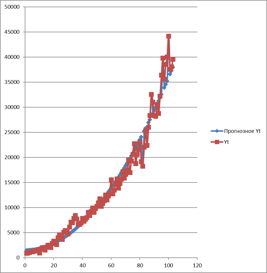где ŷ-расчётные значения, ȳ - среднее арифметическое значений переменной yt. Доля ошибки составила 2,96%.